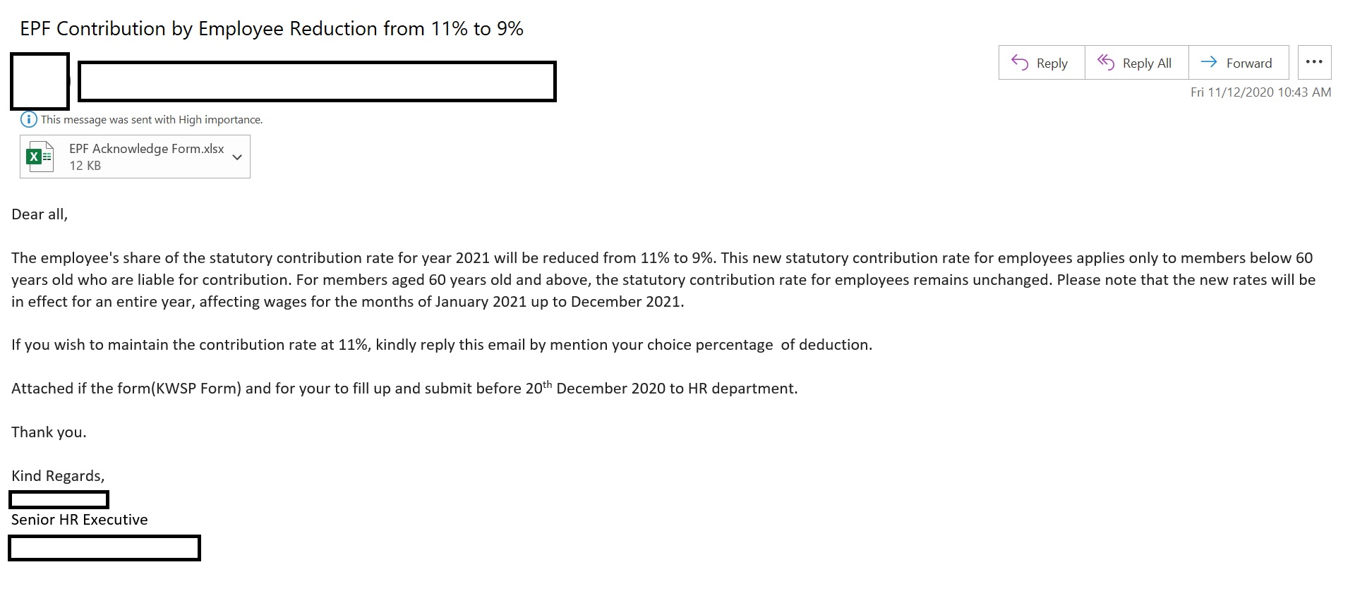 "The employee's share of the statutory contribution rate for year 2021 will be reduced from 11% to 9%. This new statutory contribution rate for employees applies only to members below 60 years old who are liable for contribution. For members aged 60 years old and above, the statutory contribution rate for employees remains unchanged. Please note that the new rates will be in effect for an entire year, affecting wages for the months of January 2021 up to December 2021."